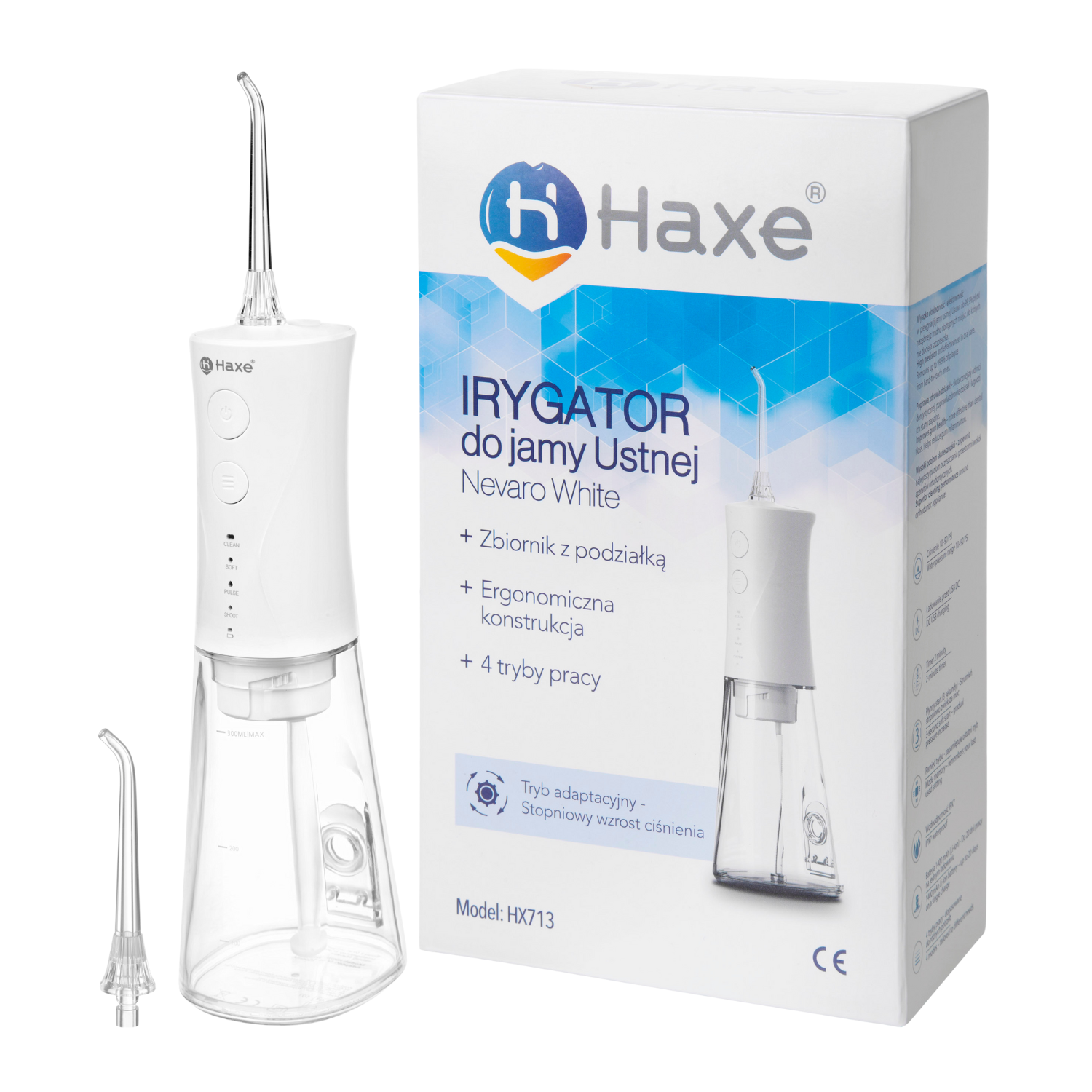 Funkcje 4 tryby pracy (CLEAN, SOFT, PULSE, CUSTOM), tryb adaptacyjny, dysza pełnoobrotowa 360°, zbiornik z podziałką 300 ml, timer 2 minuty, płynny start (ok. 3 sekundy), pamięć trybu, wodoodporność IPX7, ładowanie USB-C 5 V DC / 1 A